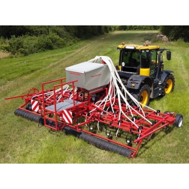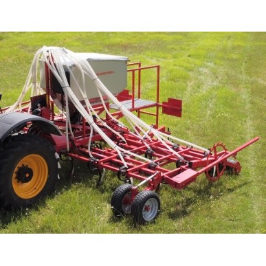 Notre semoir SemFlex EVO est un semoir de semis simplifié (qui peut être utilisé pour le semis direct) pneumatique porté, repliable en 2.55 mètres de largeur. Cette faible largeur en configuration repliée facilite les déplacements sur route. Il est équipé de 4 rangées de dents typées déchaumage qui offrent un grand dégagement. Une rangée de disques déflecteurs arrière permet de recouvrir la dernière rangée de dents et nivelle le sol. Le contrôle de la profondeur est assuré par 2 roues avant et 2 rouleaux arrière type Farmflex qui rappuient le sol, stabilisent l’outil et offrent une grande régularité d’enfouissement des semis. La distribution de type pneumatique, est alimentée par une trémie de 1500 litres.